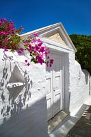 Mening van traditionele neoklassieke huizen met mooie bougainvilleabloemen in schilderachtige straten van Andros-eilandchora, Cycladen, Griekenland