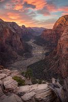 Het uitzicht vanaf angels landing in het Amerikaanse nationaal park Zion. Dit was tijdens een zons opkomst. Iedereen die deze hike heeft gedaan zal het vrij wel zeker nooit meer vergeten omdat de hike een erg spande trail heeft die niet zo heel breed is met een afgrond.