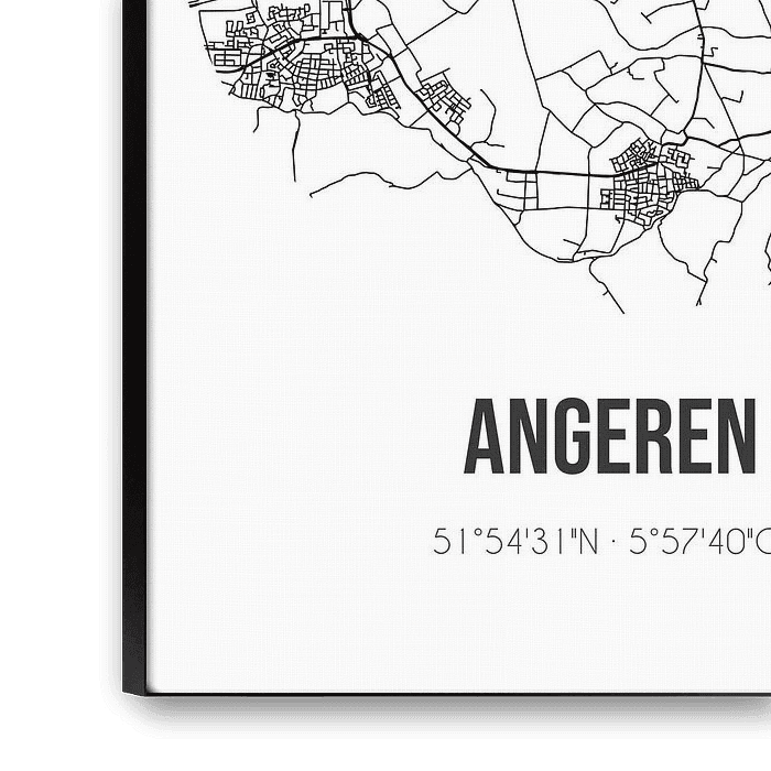 Zwart-witte landkaart, stratenplan of plattegrond van Angeren. Angeren is gelegen in de Betuwe, in de gemeente Lingewaard, provincie Gelderland. Op de stadskaart zijn alle openbare wegen in Angeren opgenomen. Verder is de kaart voorzien van de coördinaten van het centrum van Angeren.