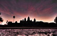 Prachtige kleuren verschijnen aan de horizon bij de tempel van Angkor Wat zodra de zon opkomt.