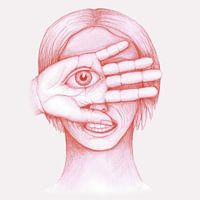 Een surrealistisch portret in rood kleurpotlood. Een persoon met een hand voor zijn gezicht. In de hand is een menselijk oog.