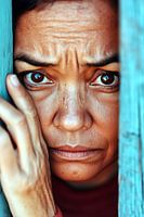 Dit spookachtige close-up portret toont een volwassen vrouw met sproeten die zich angstig verschuilt achter een halfopen blauwe houten deur. Haar gezichtsuitdrukking verraadt diepe bezorgdheid, spanning en het gevoel opgesloten te zitten - alsof ze zich verbergt voor dreigend gevaar.