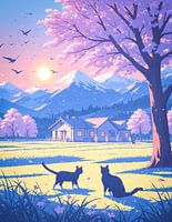 Een gouden veld strekte zich uit onder de kersenbloesems, hun zachtroze kronen verspreidden gefluister over de weide. De bergen glansden helder en eeuwig, hun besneeuwde toppen bewaakten de kalmte van de…