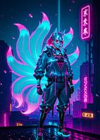 cyberpunk kitsune, neon vossengeest, negen staarten, technostrijder, futuristische bedrieger, neon stadslegende, cybergeest, gloeiend vossenmasker, cyberpunk mythologie, digitale kitsune