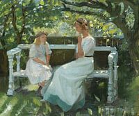 Een vrouw en een meisje, moeder en dochter, zitten op een bank in de tuin, een tuinbank. De twee blonde dames zijn in gesprek.