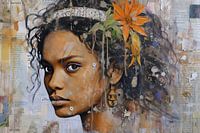 Anna Portret - abstract schilderij / mixed media kunst geschilderd. Mooi contrast tussen het verfijnde portret en rauwe collage/schildertechniek.