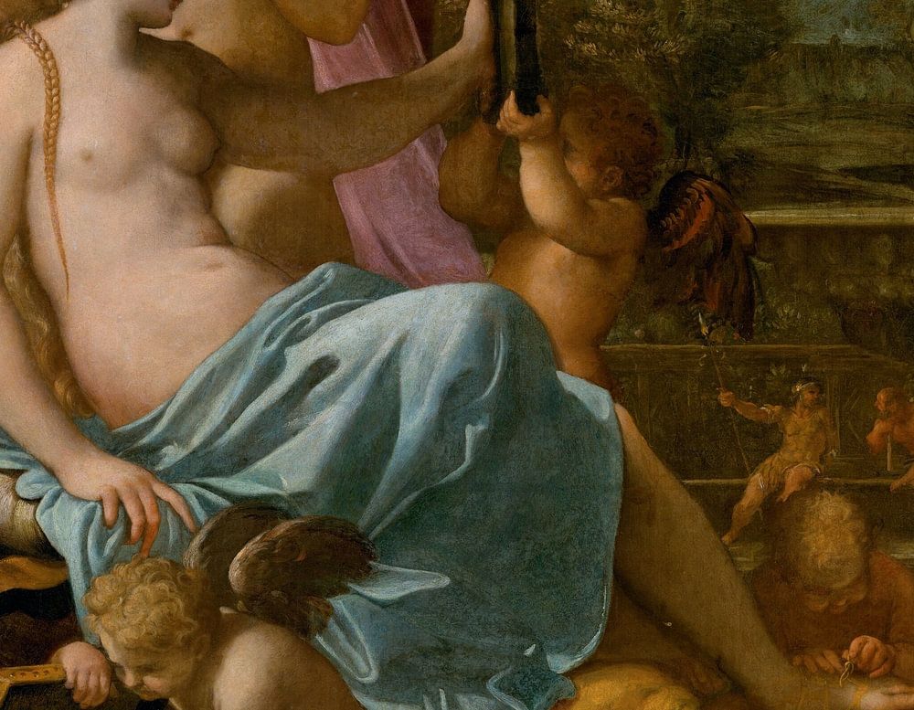 In the left half of this horizontal painting, a bare-chested, seated woman, Venus, is tended by three nude women and several child-like, nude, winged putti. All the women and putti have pale, peachy skin. To our right, a statue of a man stands on an ornately carved pedestal on a veranda in front of a distant landscape. Venus sits facing our right and she looks into a rectangular, black-framed mirror she holds up with her left hand. Her blond hair is braided and she has delicate features. A sky-blue cloth wraps around her waist and lap, and covers her legs. One foot rests on the lap of a seated putto, who ties on a sandal. Another putto helps hold up the mirror. A third putto near us, in front of Venus, pulls strings of pearls from a gold box and the fourth, in the lower left corner, lifts a comb and long needle out of a gilded, rectangular box. Two of the women behind Venus tend to her hair and the third holds up and gazes at a teardrop-shaped pearl. A dusky rose-pink curtain falls behind the women and putti. The view opens onto a terrace on the right half of the painting. A gray stone sculpture of a nude man holding up a bunch of grapes with one hand and bracing a tall stick with the other stands facing our left on an ornately carved base. The base is made up of a wide, shallow bowl above a single pedestal foot. In the distance, two people sit against a tall balustrade. The person on the left wears gold-colored armor, a helmet, and holds a long spear. The bearded man to the right appears to be nude as he leans to the side toward his companion, resting his hand and chin along a staff propped on the bench's seat. Trees and mountains in the landscape beyond are painted with brown, deep gray, and forest and sage green. A sliver of white sky along the horizon brightens an otherwise steel-gray sky.
