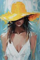 Zomerse frisheid uit, met een vrouwelijke figuur die een oogverblindende, zonnegele hoed draagt. De hoed vormt een stralend middelpunt tegen de koele, blauw-witte achtergrond, die herinneringen oproept aan een heldere hemel vermengd met de zachte beweging van de zee. De vrouw is weergegeven met een gevoel van mysterie; haar ogen zijn…