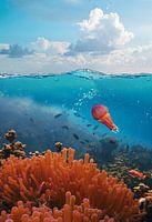 Onderwater scene met rood oranje zeeanemonen,visjes,koraal en een rode kwal onder een wit blauwe wolkenlucht. Fantasie wereld onder water.