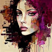 Portret van een prachtige vrouw, waarvan de haren overgaan in de muur. Beige, zwart, roze en rood. Indringende schoonheid. Lijnen en organisch. Passend bij diverse stijlen en trends.