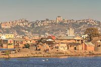 Prachtige opname van het stadsgezicht van de hoofdstad van Madagaskar, Antananarivo, met het koninklijk paleis op de achtergrond en armoede op de voorgrond