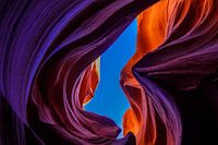 De zon en de blauwe lucht boven Lower Antelope Canyon zorgen voor een schitterend schouwspel van kleuren in de Canyon, waar wind en water voor spectaculaire vormen hebben gezorgd.