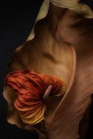 Prachtige vormen van gedroogde anthurium op een sierlijk gedroogd blad. Warme tonen en warm licht.
