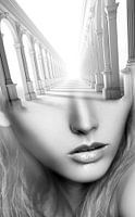 een zwart-wit foto van het gezicht van een vrouw, surrealisme, oneindige gang, met surrealistische architectuur, monochrome airbrush, realistische reflectie, akashic, mooie digitale kunst, rechtdoor, naar beneden lopen, schoonheid vrouw met gedetailleerde gezichten, gezichtsfoto