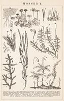 Afbeelding uit ca. 1900 in zwart wit met afbeeldingen van verschillende mossen. O.a. sterrenmos, slaapmos en bronmos.