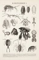 Op deze antieke gravure staan een aantal korstdieren (schaaldieren) afgebeeld. Wij zien o.a. vlokreeft, pissebed, karperluis, zeepok en strandvlo.