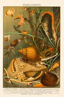 Op deze oude educatieve prent uit ca. 1900 zien wij een aantal weekdieren afgebeeld zoals slakken en mossels. O.a. draadslak, sterslak, wulk en mossel.