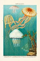 Op deze vintage kleurenplaat uit ca. 1900 staan een aantal kwallen afgebeeld. Wij zien o.a. oorkwal, goudkwal, buidelkwal, zeelong en bekerkwal.