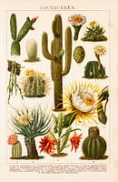 Op deze vintage kleurenplaat uit ca. 1900 zien wij een aantal verschillende cactussen afgebeeld. O.a. reuzencactus, egelcactus, koningin van de nacht en meloencactus.