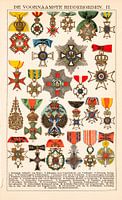 Op deze schitterend bewaard gebleven educatieve kleurenprent uit ca. 1900 staan 25 ridderorden afgebeeld uit voornamelijk Europese landen maar ook uit Japan. O.a. veel Duitse deelstaten (Beieren, Mecklenburg, Pruisen), Engeland, Hongarije, Rusland, Zweden en Noorwegen.