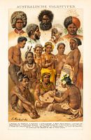 Antieke educatieve kleurenplaat uit ca. 1900 waarop wij een aantal volkstypen uit Australië en Oceanië zien afgebeeld. O.a. Tasmanië, Maori (Nieuw-Zeeland), Tonga, aboriginals, en Marsshall eilanden.