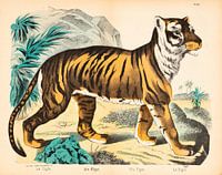 Dit is een reproductie van een zeer oude schoolplaat met een afbeelding van een tijger niet geheel naar de waarheid. Het betreft hier een voorloper van de litho techniek, de prent komt uit ca. 1875. de tekeningen zijn naïef vormgegeven en ingekleurd. Bijzondere vintage illustratie.