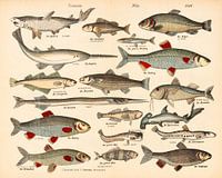 Dit is een reproductie van een zeer oude schoolplaat met een wonderlijke collectie zeevissen. Het betreft hier een voorloper van de litho techniek, de prent komt uit ca. 1875. de tekeningen zijn naïef vormgegeven.