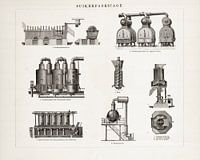 Op deze gravure uit ca. 1900 zien wij een complete suikerfabriek afgebeeld. Alle machines die rond deze tijd werden gebruikt voor de productie van suiker uit bieten.