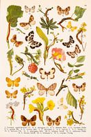 Vintage natuurhistorische afbeelding uit ca. 1910 waarop vele vlinders en hun rupsen staan afgebeeld. Verder de flora waarmee de rupsen zich voeden. De Latijnse namen staan onder de afbeelding vermeld. Wij zien o.a. de vierbandmeter, koolmeter en herfstvlinder.