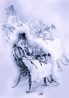 Ina Hölzel beeldbewerking. Een antieke prent, ouder dan 100 jaar. Op de computer bewerkt. Ik heb de kleur en uitvoering in een nieuw jasje gestoken. De oorspronkelijke prent is een gravure, te zien bij het uitvergroten en afdrukken. De romantische dame draagt kleding uit de 19e eeuw. Let op de details. Van deze prent heb ik verschillende varianten gemaakt. Je kan de kleur kiezen die het beste bij je interieur past. Op aanvraag kunnen de tinten aangepast worden.
