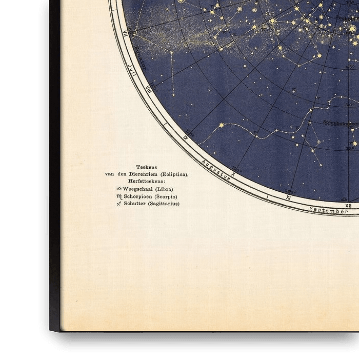 Kleurenkaart uit ca. 1900 van de sterren aan de zuidelijke hemel. Hierop afgebeeld de tekens van de dierenriem (sterrenbeelden). Wij hebben ook een versie met een overslagvel met tekst beschikbaar.