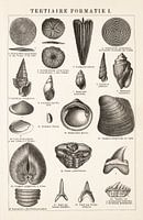 Fraaie vintage afbeelding van vondsten uit de tertiaire formatie. Het Tertiair is een geologisch tijdperk dat volgt op het Krijt en wordt opgevolgd door het Kwartair. Het Tertiair duurde van 66,0 tot 2,58 miljoen jaar geleden. Wij zien o.a. schelpen en haaientanden.