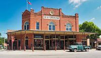 voor de winkel staat een klassieke Amerikaanse pickup truck.