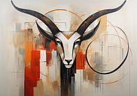 Antilope - Het werk toont een gestileerde afbeelding van een antilope met prominente, lang uitgestrekte hoorns, geplaatst tegen een abstracte achtergrond met blokken in warme aarde- en oranjetinten. Dynamische cirkellijnen omlijsten het dier, terwijl de strakke geometrische vormen en gestapelde kleuren een moderne uitstraling geven. Het…