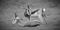 Een antiloop rust in het groene gras de ander houdt de wacht. Deze dieren nemen instinctief deze houding aan aangezien ze zijn gewent aan de ruige wildernis in Afrika en Azie.