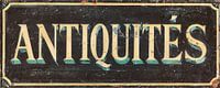 Oud verweerd winkel bord met de franse tekst 'Antiek'