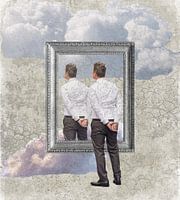 Surrealistich beeld van een man die zichzelf aan de achterkant gereflecteerd ziet in de spiegel. Staat symbool voor deze tijd waarin we onszelf achternalopen zonder om te kijken en een pas op de plaats te maken.