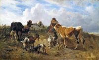 Een vrouw, een moeder met kind zit op een heuvel in het veld met om haar heen het vee, koeien en geiten. een agrarisch beeld in een landschap op een schilderij als kunstwerk.
