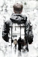 Doorkijkje met de ingang van het Centraal Station antwerpen. Mysterieuze sfeer, straat fotografie , modern abstract. Veel volk in de stad. Antwerpen stad is een leuke stad om te shoppen en terrasje te doen.