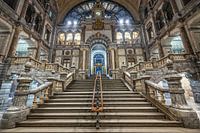 Het station Antwerpen Centraal, gebouwd in 1899, is een architectonisch hoogstandje! Deze foto is een lange belichting, wat het mogelijk maakt om de vele passagiers, die vooral gebruik maken van de grote buitentrap, onzichtbaar in beeld te brengen. Om zoveel mogelijk van deze prachtige architectuur te kunnen vastleggen, is gebruik gemaakt van een groothoeklens met een korte brandpuntsafstand. De hoge contrasten, de verschillende lichtbronnen en ook de sterke spots die rechtstreeks in de lens schijnen, maken het fotografisch erg moeilijk om een evenwichtig beeld te creëren. Met veel zorgvuldigheid is dat hier toch gelukt, met als resultaat een op groot formaat afdrukbare foto....