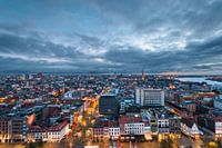 Uitzicht op de stad Antwerpen tijdens het invallen van de avond. Deze foto is genomen vanaf het dak van het Museum aan de Stroom (MAS). De kerktoren van de Onze-Lieve-Vrouwekathedraal is zichtbaar aan de horizon.