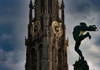 beeld van Silvius Brabo op de Grote Markt in Antwerpen met de toren van onze Lieve Vrouwekathedraal op de achtergrond.