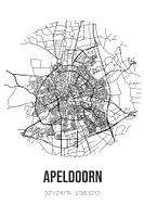 Zwart-witte landkaart, stratenplan of plattegrond van Apeldoorn. Apeldoorn is gelegen op de Veluwe, in de gemeente Apeldoorn, provincie Gelderland. Op de stadskaart zijn alle openbare wegen in Apeldoorn opgenomen. Verder is de kaart voorzien van de coördinaten van het centrum van Apeldoorn.