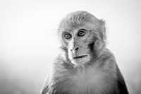 Portret van een aap bij de apentempel Swayambhunath, temple of the apes. Stoepa. Zwart wit foto. Klein aapje met grote ogen.