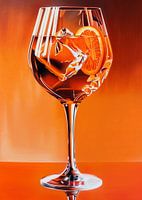 Een prachtig geïllustreerde afbeelding van een glas Aperol Spritz. De kleur is in warme oranje tinten.