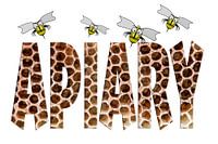 The word apiary with an overlay of honeycomb and bees buzzing around