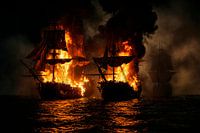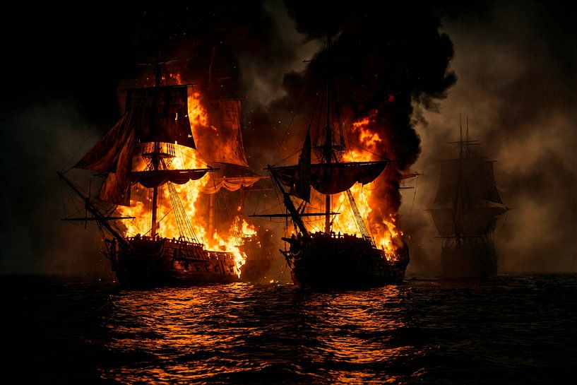 Twee monumentale 18de-eeuwse zeilschepen staan in brand en domineren de voorgrond, als een symbool van brute vernietiging. De intense vlammenzee is de enige lichtbron in deze donkere, stormachtige nacht en werpt een angstaanjagende oranje gloed op het onrustige zeewater. Een dicht en verstikkend gordijn van zwarte rook stijgt op en…