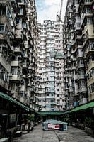 Appartementsblok in Hong Kong met alle woning en ruimte ertussen dicht op elkaar. Hoogbouw met stukken gebouw die uit steken.