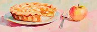 Appel en Taart Kunst - Dit stilleven schilderij toont een uitnodigend tafereel met een smakelijke appeltaart op een bord, vergezeld door een fris uitziende appel en een vork op een lichtroze achtergrond, geschilderd met levendige pastelkleuren en zachte penseelstreken die een gezellige, huiselijke sfeer oproepen.