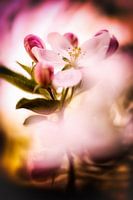 Het magische moment waarop de krachtige, verwarmende lentezon rond de pas geopende appelbloesem danst. Macro fotografie.